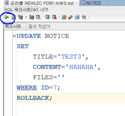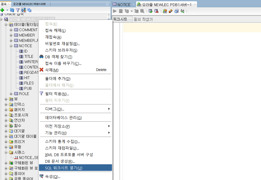원하는 서버에서 SQL워크시트 열기로 열면 작성하는 창이 열린다.