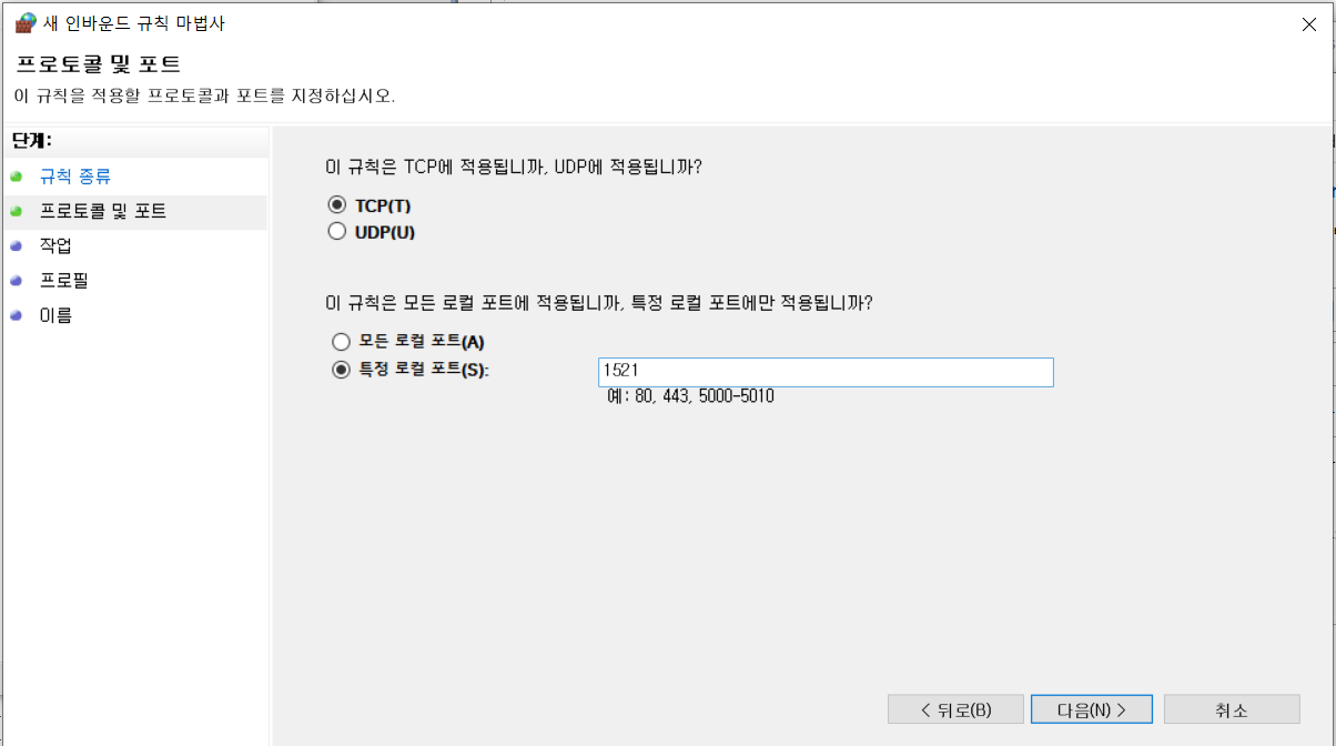 포트선택/프로토콜 및 포트/특정 로컬포트 1521/