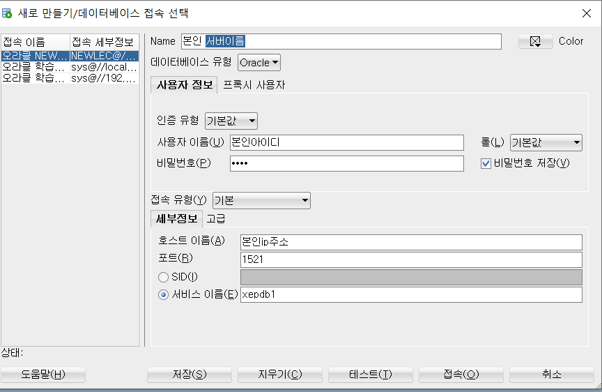 Name, 사용자이름, 비밀번호, 호스트이름, 서비스이름은 본인에 맞게 입력해야한다.(자신이 만든DB적는것이다.)