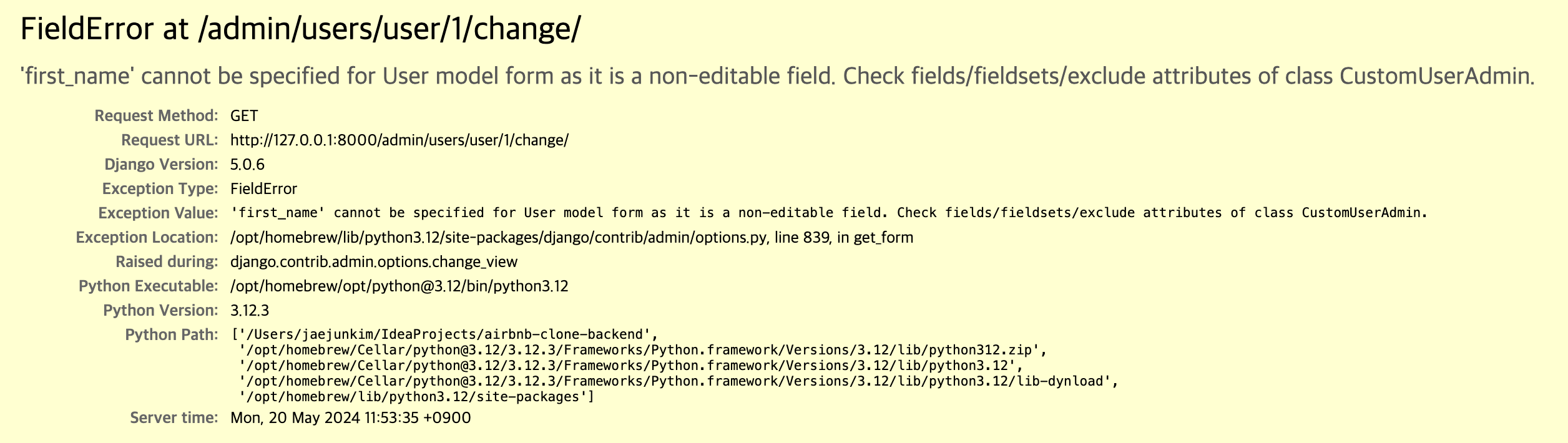 first_name과 last_name을 editable=false로 해두었는데 관리자 페이지에 들어가면 편집행위가 들어가기때문에 에러가 발생한것