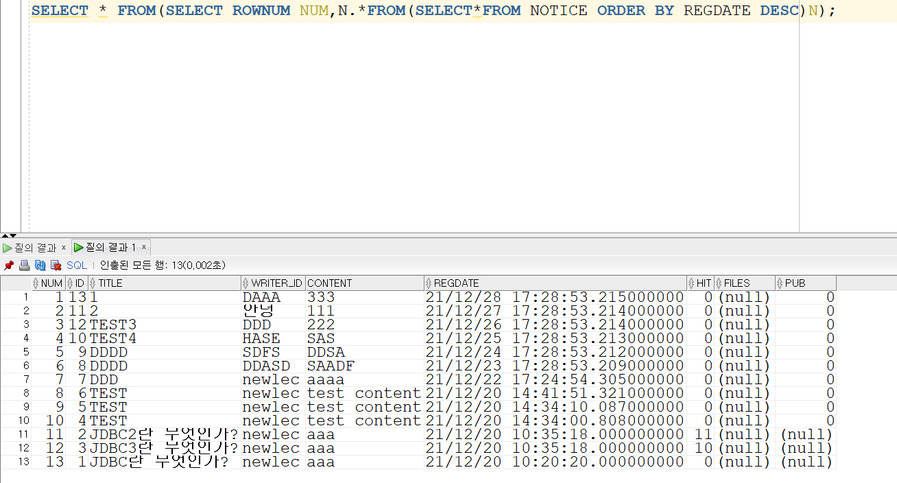 또한 복잡했던 SQL문을 VIEW로 저장함으로써 간단하게 조회할 수있다.(아래 실행결과에는 WHERE NUM BETWWEN 2 AND 10;은 하지않았다.)