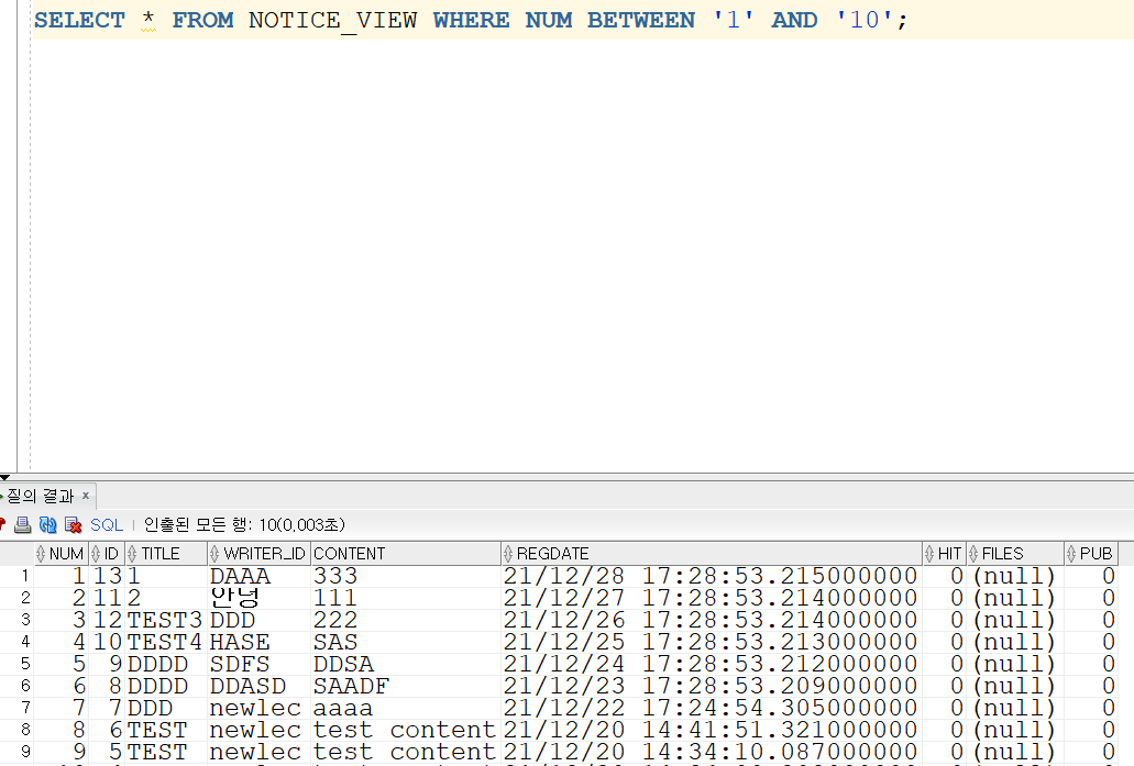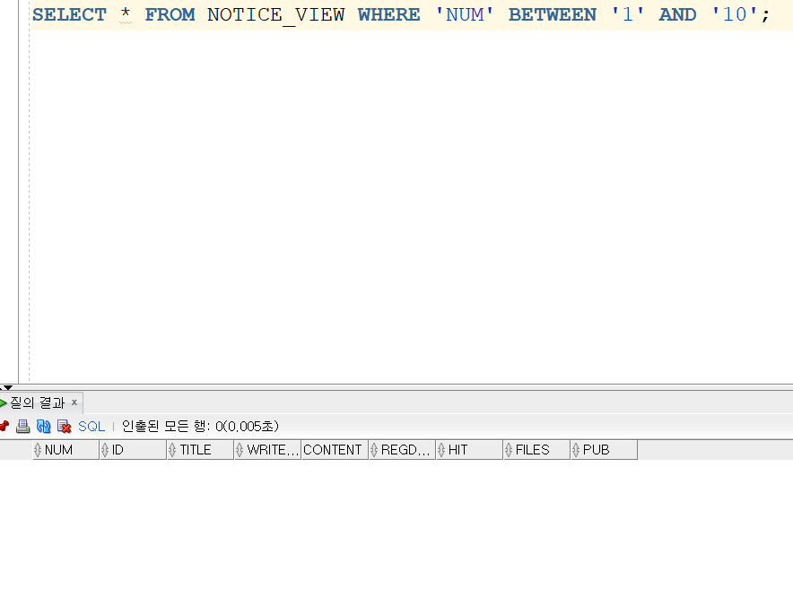 SELECT * FROM NOTICE_VIEW WHERE 'field' LIKE NUM BETWEEN '1' AND '10' ;