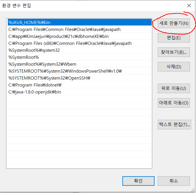 자바폴더를 Path에 추가하는거다. 아까 JAVA_HOME변수를 안 만들었다면 전체 경로를 적어도 무방하다.