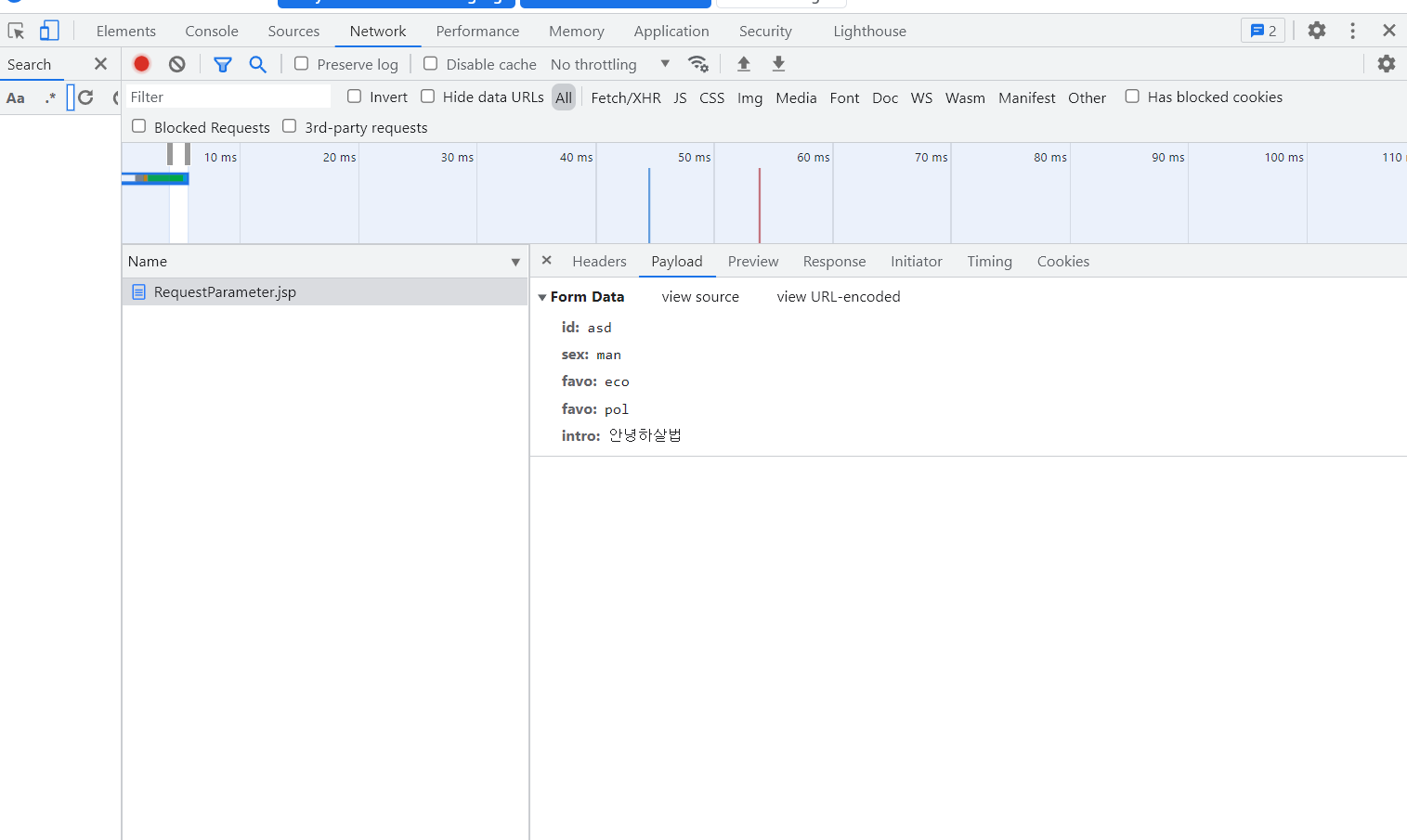 개발자모드에서 Network누르고 보낸 jsp누르고 옆에Payload누르면 보낸 파라미터값을 확인 할 수 있다.